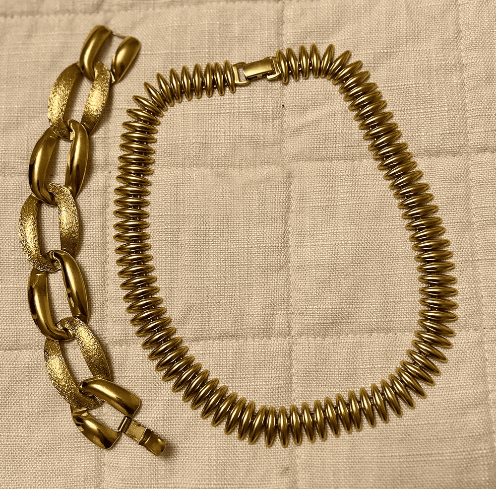 The Find: Bypass modern plastic and head straight to the vintage market. Search for 1970s or 80s Napier, Monet, or Trifari. Look for heavy gold-plated collars, substantial "door-knocker" pendants, or thick herringbone chains that sit flat against the skin.