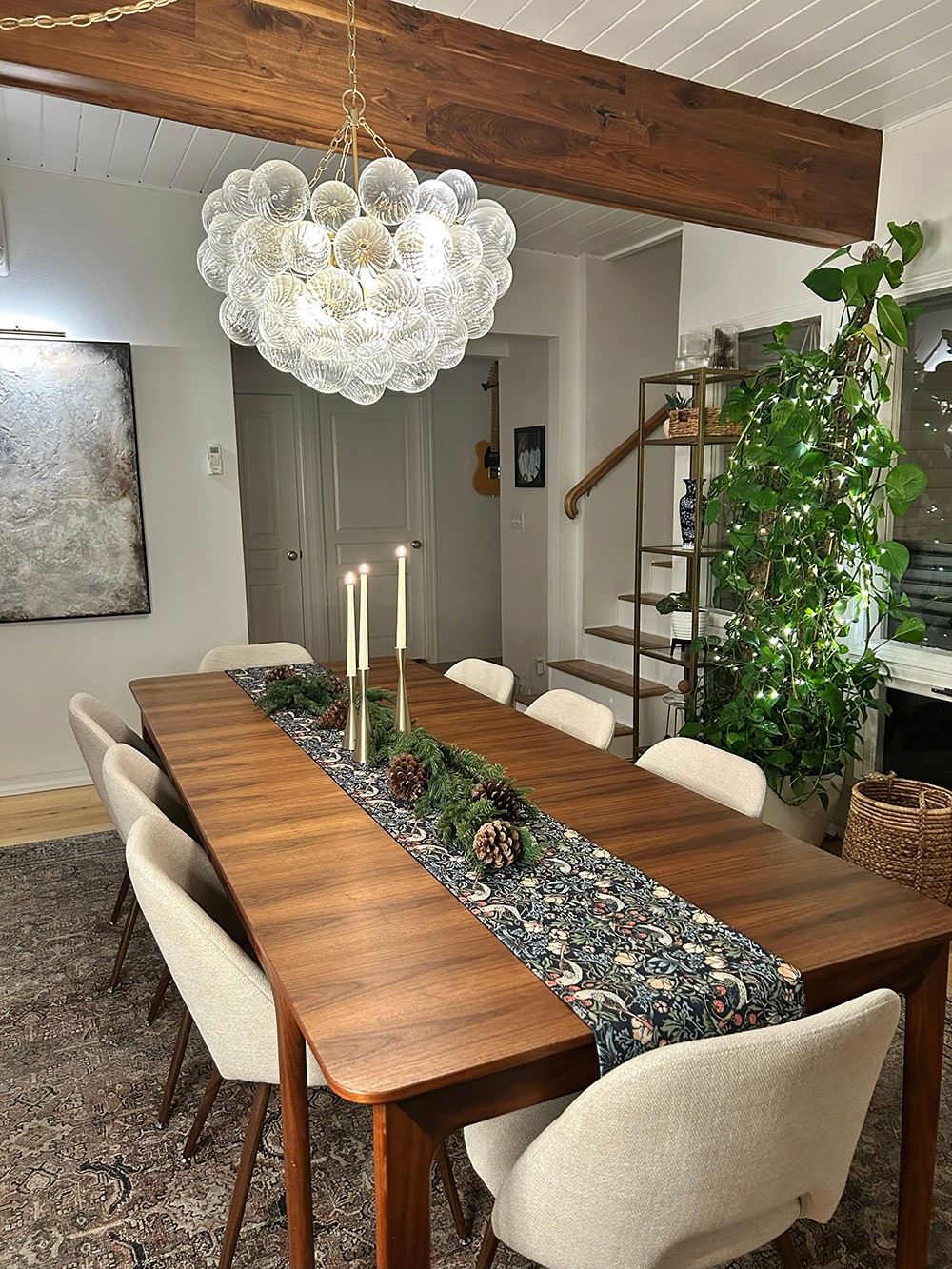 Never underestimate the power of a dimmer switch and a flame. The bubble glass chandelier offers a modern, diffused glow for general eating. But when it’s time to entertain, we dim that down and light the tall tapers.