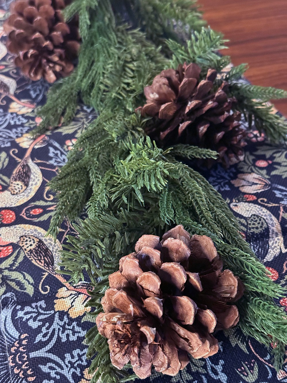 To keep it grounded and authentic, we layered in real pinecones foraged from our own yard. This gives you that "high-low" mix—the durability of the faux greens with the imperfect, organic texture of nature.
