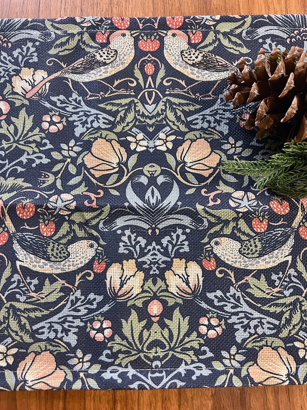 For this table, the foundation is that stunning runner. It features a William Morris-esque botanical print in dark hues. It feels historical and collected. Here is the secret regarding busy prints: they are incredibly forgiving. Unlike a crisp white linen runner that broadcasts every drop of spaghetti sauce or coffee ring, a dark, complex pattern hides a multitude of sins. It allows you to leave the runner out 24/7 without constantly running the washing machine. It anchors the room with deep blues, greens, and rust tones that feel seasonal without being cliché. When your linens have this much personality, your plates can remain simple and clean.
